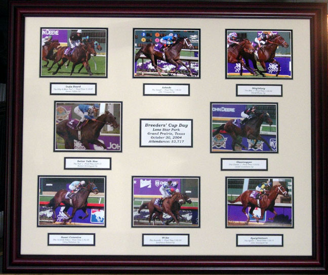 This framed collectible contains custom photographs of all eight Breeders' Cup winners from 2004 ar Lone Star Park in Texas. There are individual photographs of Ghostzapper, Better Talk Now, Ashado, Singletary, Ouija Board, Wilko, Sweet Catomine and Speightstown. These photographs are double matted with double matted key ways describing each race as well as a double matted title key way in the center of the collage. This collectible is framed in a beautiful mahogany frame ready for hanging in your home or office. This would be a great gift idea for a Breeders' Cup attendee, fan or just treat yourself. These original photographs are very sharp and have individual listings on this site that will give you a better representation of their quality. Use the search box in the upper left hand corner of this page to see their sharpness and brilliance. Also this multi-opening double mat, precision cut by computer driven cutters, is perfectly balanced and centered. Overall size 22" x 26". Own a piece of racing history. Free shipping to all U.S. continental addresses comes with this beautiful item.