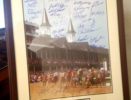 16x20 print signed by 30 Kentucky Derby winning riders. Free Shipping to all U.S. addresses. Signd by Turcotte, Mangenello, York, Cruguet, Espinoza, Santos, Vasquez, Smith, Baeza, Perret, Cauthen, Prado, Franklin, Boland, Ussery, Desourmeaux, Brumfield, Pincay, Erb, Day, McCarron, Stevens, Rosario, Velasquez, Chavez, Borel, Elliott, Valenzuela, Bailey, Velazquez.