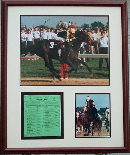 Seattle Slew 1977 Kentucky Derby Commemorative This spectacular collectible commemorates the 1977 Kentucky Derby and Triple Crown winner Seattle Slew. This framed item features a 16" x 20" and an 8" x 10" of the finish of the race, one of the photos is signed by winning rider Jean Cruguet and a mint condition race day program. These items are double matted in acid free gallery level mat board. The photos are professionally dry mounted. Finished in a mahogany frame moulding measuring 28" x 34", this item is a great fit. in any home or office. Comes with certificate of authenticity for Jean Cruguet's signature. Shipping and insurance included in price for all U.S. addresses.